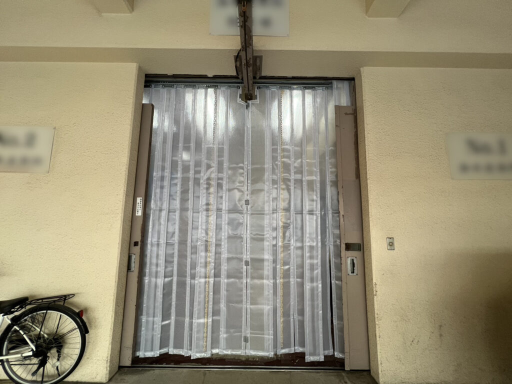 倉庫の出入り口開口部にビニールシートを短冊状にカット・加工したのれんシートを施工しました。目的は、倉庫内の空調効率アップです。